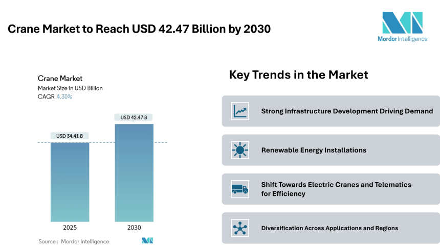 The crane market reached USD 34.41 billion in 2025 and is projected to advance to USD 42.47 billion by 2030, translating into a 4.30% CAGR. This growth is underpinned by a variety of factors, including increased public infrastructure spending, large-scale private megaprojects, and a growing emphasis on renewable energy installations. As the world navigates evolving construction needs and energy transitions, the demand for versatile, high capacity lifting equipment continues to rise.