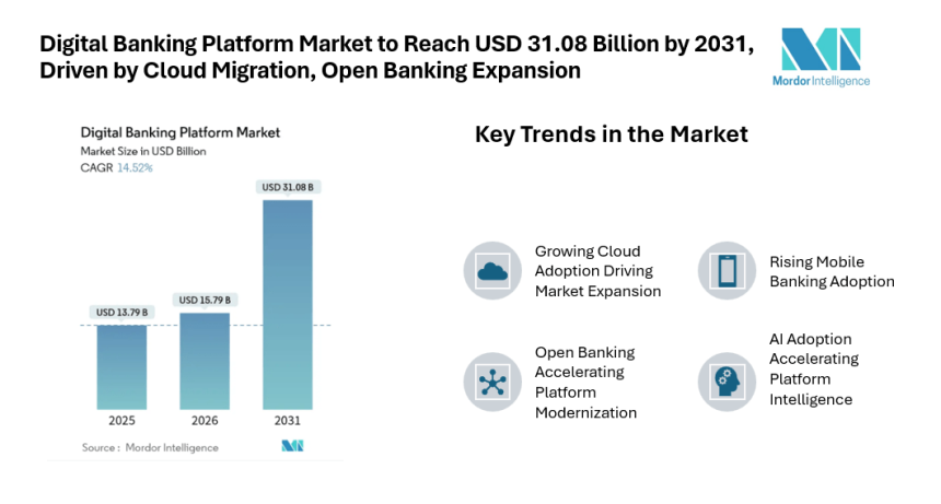 According to Mordor Intelligence, the digital banking platform market size was valued at USD 13.79 billion in 2025 and is estimated to reach USD 15.79 billion in 2026, advancing toward USD 31.08 billion by 2031 at a CAGR of 14.52% during the forecast period. This steady rise reflects the growing importance of digital infrastructure as financial institutions modernize their technology foundations to deliver seamless, real-time services across retail and corporate banking environments. The digital banking platform market growth is supported by increasing migration from legacy banking systems to flexible digital platforms.