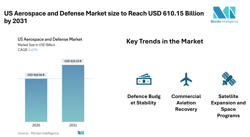According to Mordor Intelligence, the US aerospace and defense market size is valued at USD 463.06 billion in 2026 and is expected to reach USD 610.15 billion by 2031, reflecting steady expansion supported by consistent government defense budgets, renewed commercial aircraft demand, and the rapid development of satellite infrastructure.